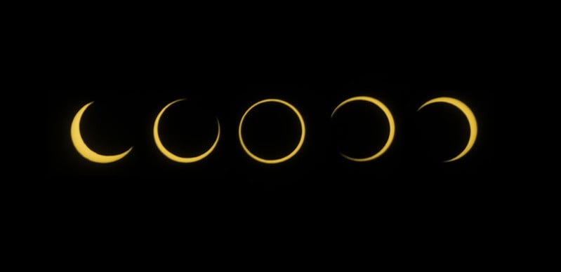 Fun fact: in the current 5,000 year epoch annulars are actually more common than total solar eclipses, to the tune of 33.2% annulars, to 26.7% totals… the remainder being hybrids and partials. This is even becoming more so, as the Moon recedes from the Earth. In about 600 million years time, the final total solar eclipse will occur. We live in a fortunate time, indeed.