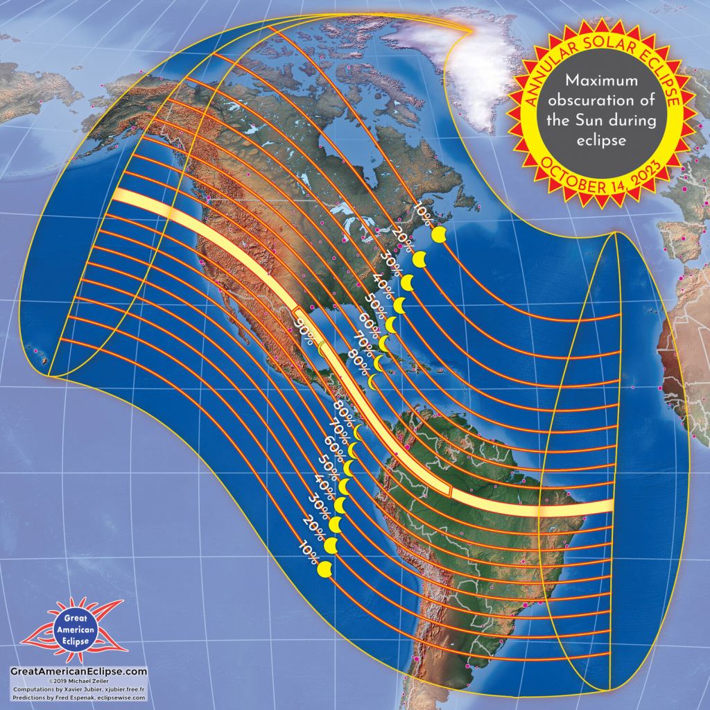 If skies are clear, observers across a swath of the western United States, Mexico, and Central and South America are in for a treat this coming Saturday, October 14th, as the antumbral shadow of the Moon crosses the Earth in a fine 'ring of fire' annular solar eclipse.