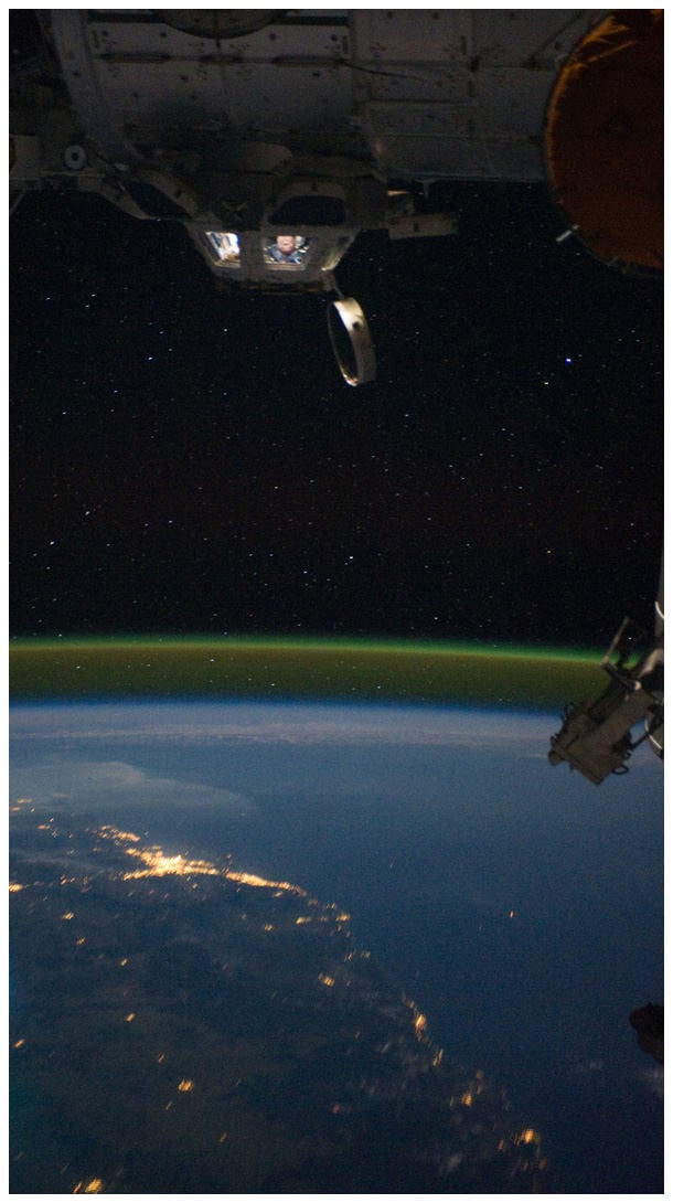 But he set up a Nikon D3S camera in the Cupola on the space station (see an awesome picture of him, below, working in the Cupola), took some practice shots, and worked on getting the right settings, then set up the camera to take about 500 pictures at 3-second intervals.