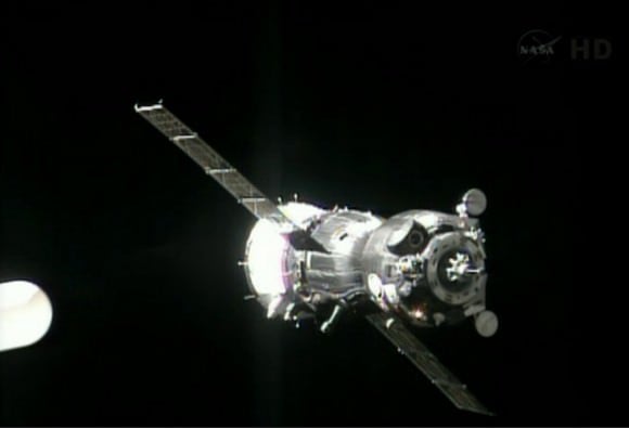 Screenshot from NASA TV of the Soyuz TMA-09M spacecraft arriving at the International Space Station.[/caption]