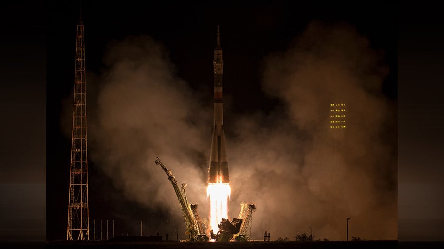 The Soyuz MS-06 rocket blasts off with the Expedition 53-54 crew towards the International Space Station from the Baikonur Cosmodrome in Kazakhstan, Tuesday, Sept. 12, 2017 (Wednesday, Sept. 13, Kazakh time). Credit: NASA/Bill Ingalls[/caption]