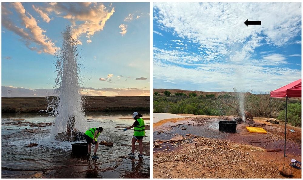 *The researchers used plastic bins to gather samples from the Crystal geyser (left) and the Champagne geyser (right). The black arrow highlights how high material from Champagne travels. The samples were subjected to both chemical and biological analyses. Image Credit: Cable et al. 2026 AstroBio*