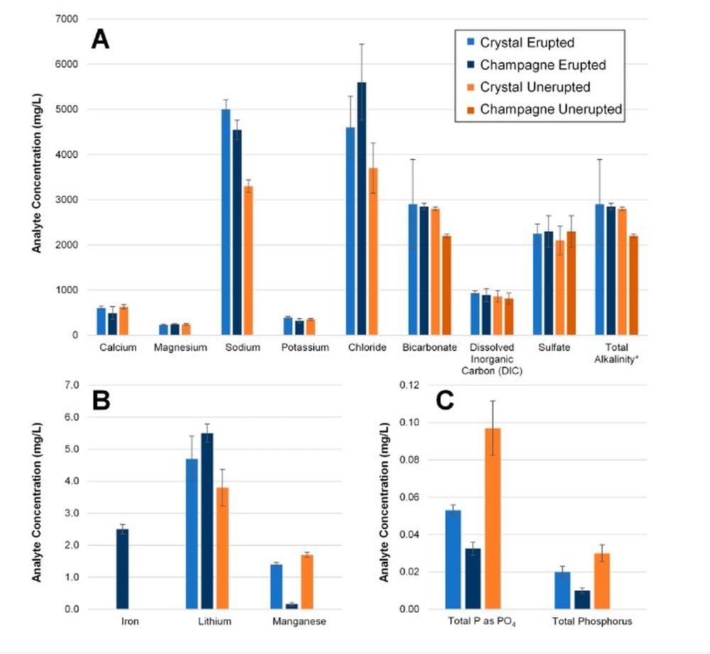 *Chemical analysis results for erupted and unerupted samples form the Champagne and Crystal geysers. Differences between erupted and unerupted samples indicate the difficulty in understanding how plumes on ocean moons can differ from the oceans they erupt from. Image Credit: Cable et al. 2026 AstroBio*