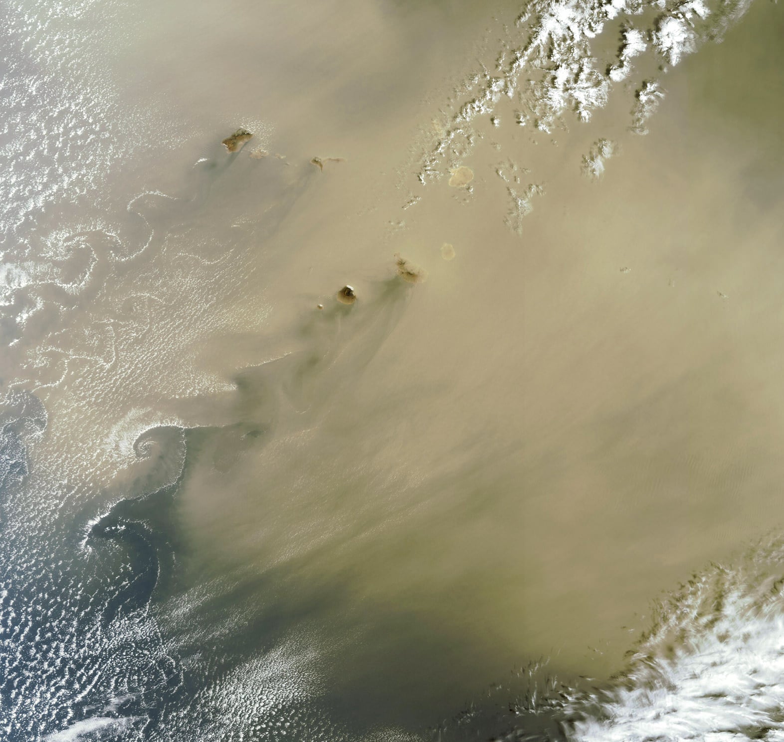 Thick dust from the Sahara blowing over the ocean off the western coast of Africa encounters the islands of Cape Verde, forming a wake of swirling "vortex streets" visible by satellite.