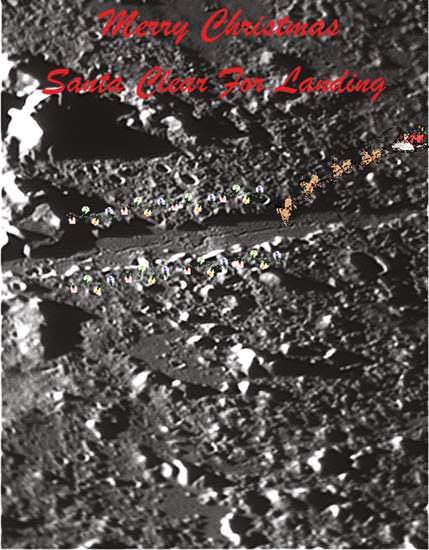 Only one more day left until Christmas Eve, and astronomers have just discovered a unique feature on the lunar surface. Although accepted for many years to be a natural feature of selenography, modern astrophotography coupled with today's high-powered telescopes have discovered an area near the lunar North Pole that's apparently being used as a runway by a man in a red suit piloting an unusual spacecraft...