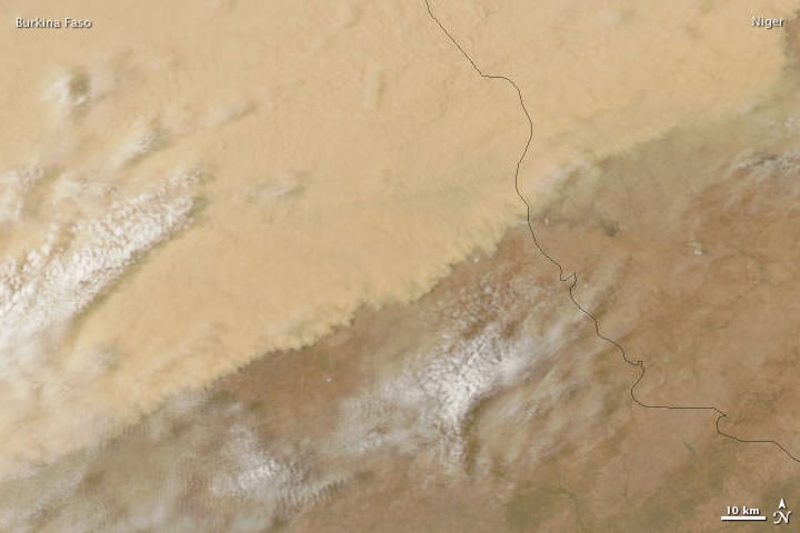 The region affected by this dust storm includes not just the Sahara Desert but also the Sahel, a semi-arid grassland region bordering the massive desert on the south. The dust plume hovers primarily over Burkina Faso and Mali. Straddling the border between Burkina Faso and Niger, an especially thick layer of dust appears to push southeastward.