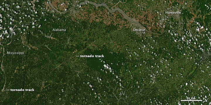 [caption id="attachment_85337" align="aligncenter" width="537" caption="Part of the path of a 12-mile swath of destruction in Alabama from an EF4 tornado on April 27. Click to see the entire swath taken by a NOAA satellite. Credit: NOAA"]