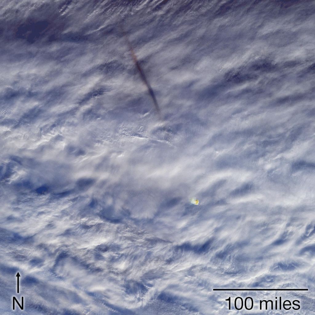 On December 18th, 2018, another fireball appeared in the skies over Russia that exploded at an altitude of about 26 km (16 mi) above the Bering Sea. The resulting debris was observed by instruments aboard the NASA Terra Earth Observation System (EOS) satellite, which captured images of the remnants of the large meteor a few minutes after it exploded.
