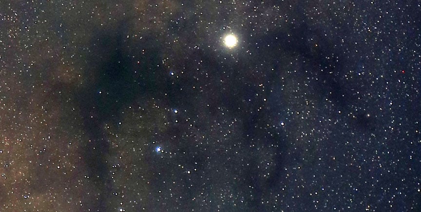 There are more obvious parts of the Rift to the naked eye but few conjure up as striking an image as the Dark Horse, located about one outstretched fist to the left of the Scorpius' brightest star, Antares. Saturn sits astride the horse's back or eastern side. While it's fun to see the horse as a single figure, astronomers catalog the various body parts as individual dark nebulae with separate numbers and even names. The largest part of the horse, the hind leg, is nicknamed the Pipe Nebula and lies 600-700 light years away. The Pipe is further subdivided into B59, B72, B77 and B78, from a survey of dark nebulae by early 20th century American astronomer
