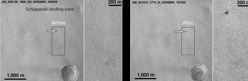 Instead of a controlled descent to the surface using its thrusters, ESA's Schiaparelli lander hit the ground hard and may very well have exploded on impact. NASA's Mars Reconnaissance Orbiter then-and-now photos of the landing site have identified new markings on the surface of the Red Planet that are believed connected to the ill-fated lander.