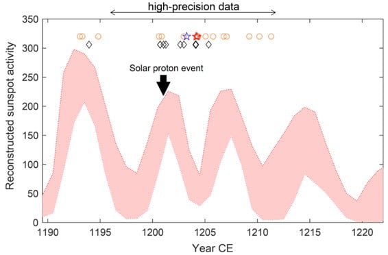 When the team did a reconstruction of solar cycles of the time, they found that this particular SPE occurred at the maximum of that solar cycle. Further studies showed that cycles in that period of history were quite a bit shorter than what we experience in modern times and suggests extremely high solar activity. “The high-precision data not only allowed us to accurately date sub-extreme solar proton events, but it also lets us clearly reconstruct the solar cycles of the period,” said Miyahara. “Today, the Sun’s activity fluctuates over eleven-year-long cycles, but we’ve found that the cycle was just seven to eight years long back then, indicating a very active Sun. The SPE we have dated occurred at the peak of one of these cycles.”