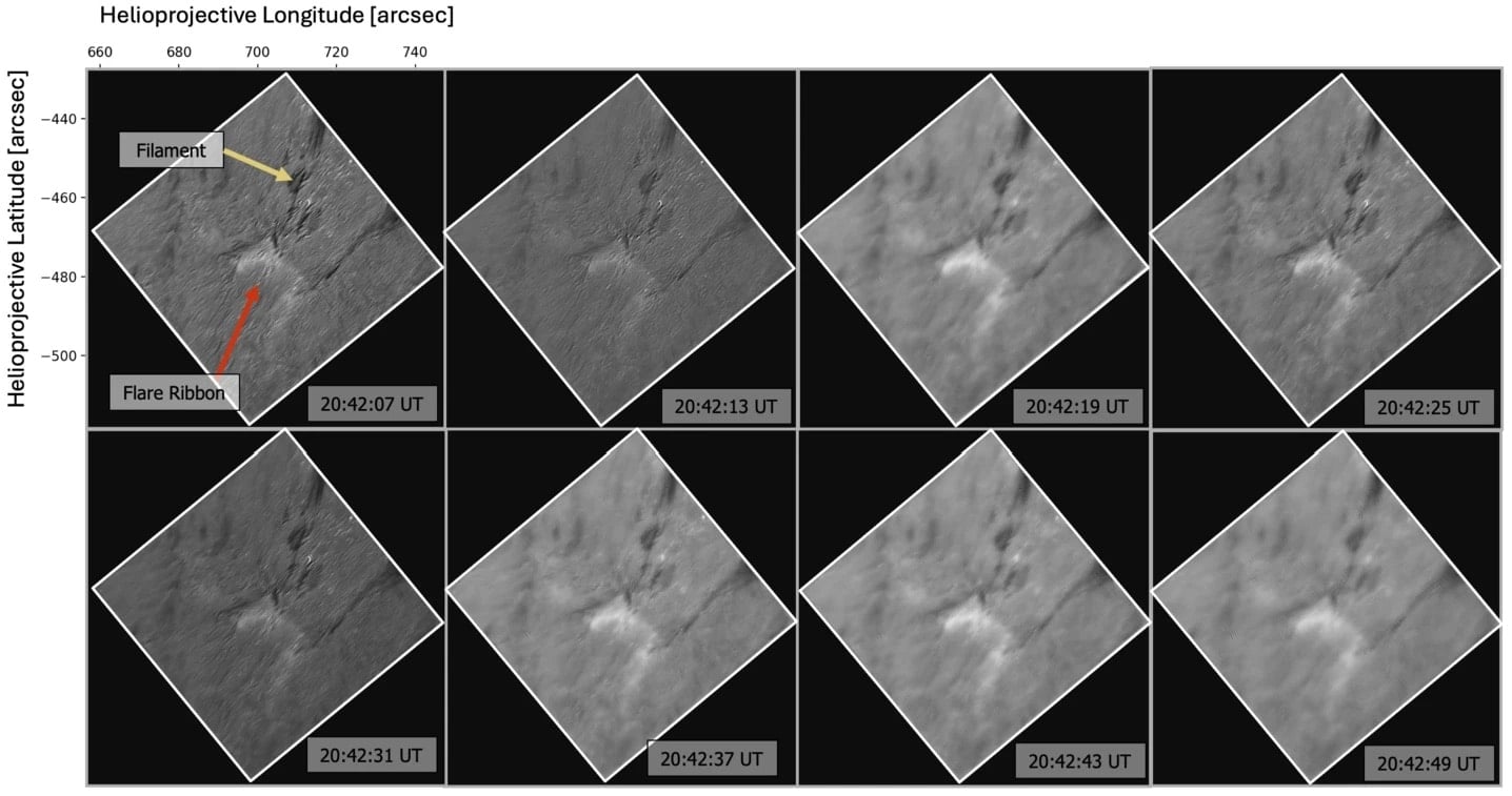 This sequences shows the evolution of a bright flare ribbon using the Visible Broadband Imager on the Daniel K. Inouye Solar Telescope. The flare occurred in active region 13078. Credit: Tamburri, et al.