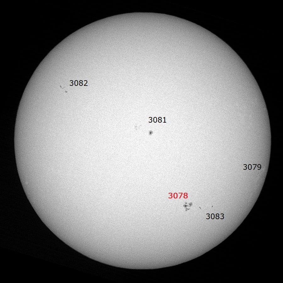 A visible image of the Sun on August 19, 2022, showing sunspots and their active regions, including 3078 where the DKIST observed unusual spectral lines. Courtesy CESAR Helios Observatory.