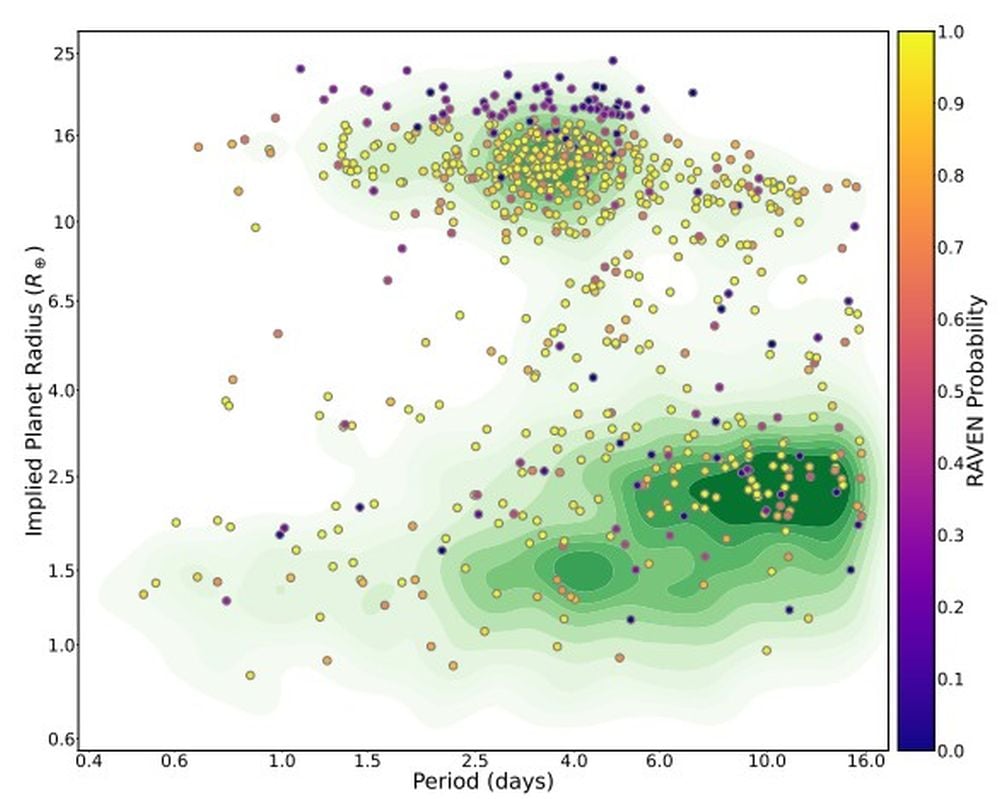 This figure is a Radius-Period plot in logarithmic scale for 705 Planet TOIs in the sample. They're overlaid over a density plot of the known planet population with orbital periods less than 16 days. The planet TOIs are shaded based on their RAVEN Probability to illustrate the tool’s performance across the parameter space. Image Credit: Hadjigeorghiou et al. 2026. MNRAS.