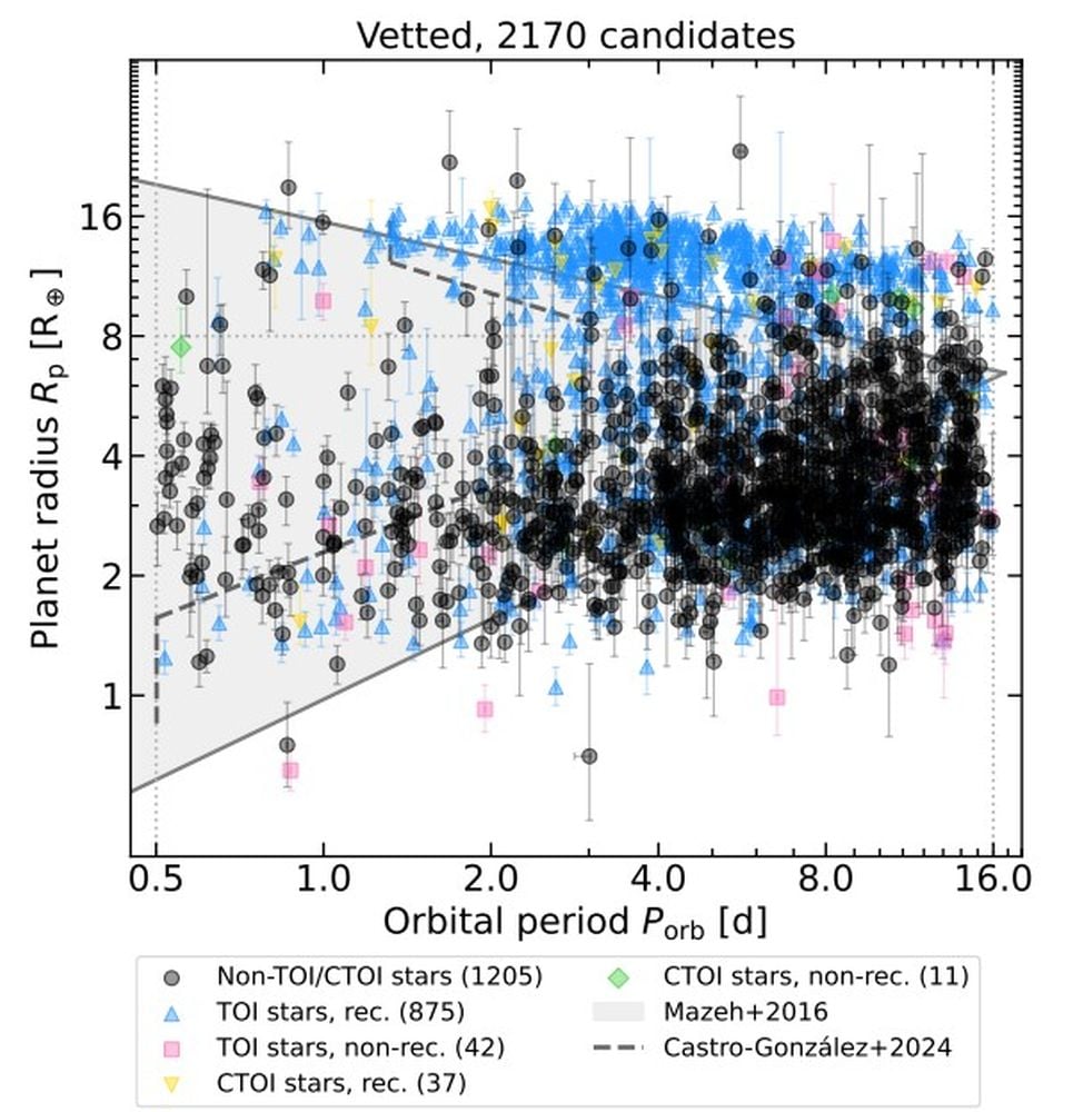 This figure shows the 2,170 candidates RAVEN found in the TESS data. Over half of them are new candidates, shown as non-Tess Objects of Interest / Community Tess Object of Interest. "Solid grey lines and grey-shaded area show the Neptunian desert limits, and dashed grey lines show the recently derived limits between the Neptunian desert, ridge, and savannah," the authors write. Those three features define the population of Neptune sized exoplanets with short orbital periods. Image Credit: M. Lafarga et al. 2026. MNRAS.