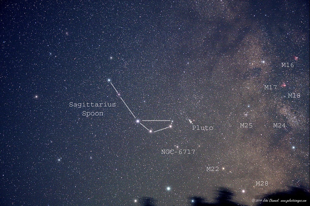 at 10:00 UT/6:00 AM EDT, marking a period when it will rise opposite to the setting Sun and transit highest near local midnight. Pluto spends all of 2015 in the constellation Sagittarius. This presents two difficulties: 1). We're currently looking at Pluto against the very star-rich backdrop towards the center of the Milky Way Galaxy, and 2). Its southerly declination means that it won't really 'clear the weeds' much for northern hemisphere observers.