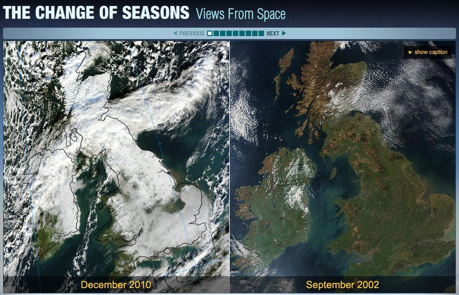 allows you to see – as well as share – the changing seasons here on Earth. From space, NASA satellites record the change of seasons, which scientists study regional patterns on Earth. These images also help show bigger changes that may occur over many years, and the slide show, "The Change of Seasons: Views from Space," shows some of the ways seasonal change affects our planet, and invites you to share your own photos of seasonal change where you live.
