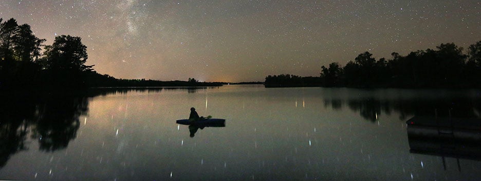 Framed by stars reflected by water, a kayaker leans back to take in the grandeur of the night sky. The photo appears in my new book in the chapter titled "Stars on Water." Credit: Bob King[/caption]