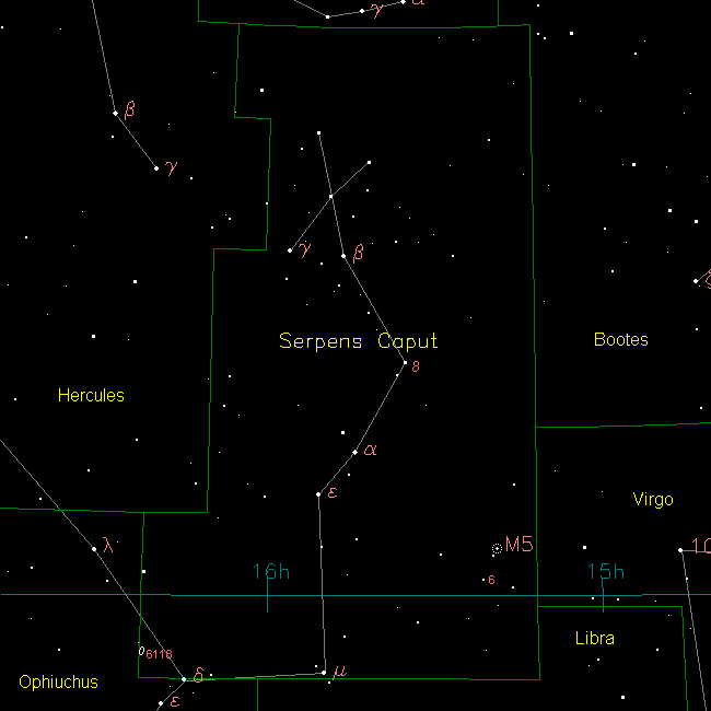 For binoculars and all telescopes, let's take a look a Messier 5 (RA 15 : 18.6 Dec +02 : 05). At nearly unaided eye visible, you'll like this one! This fifth brightest globular cluster in the sky is considered one of the most ancient at 13 billion years old. Located further away from the dusty galactic center, resolution explodes as we move up in aperture. Easily seen as a round ball of unresolved stars in binoculars, small scopes begin to pick up individual stellar points at higher magnifications. Careful attention shows that M5 is not perfectly round. Its brightest 11th and 12th magnitude stars actually are randomly distributed but seem to array themselves in great arcs.