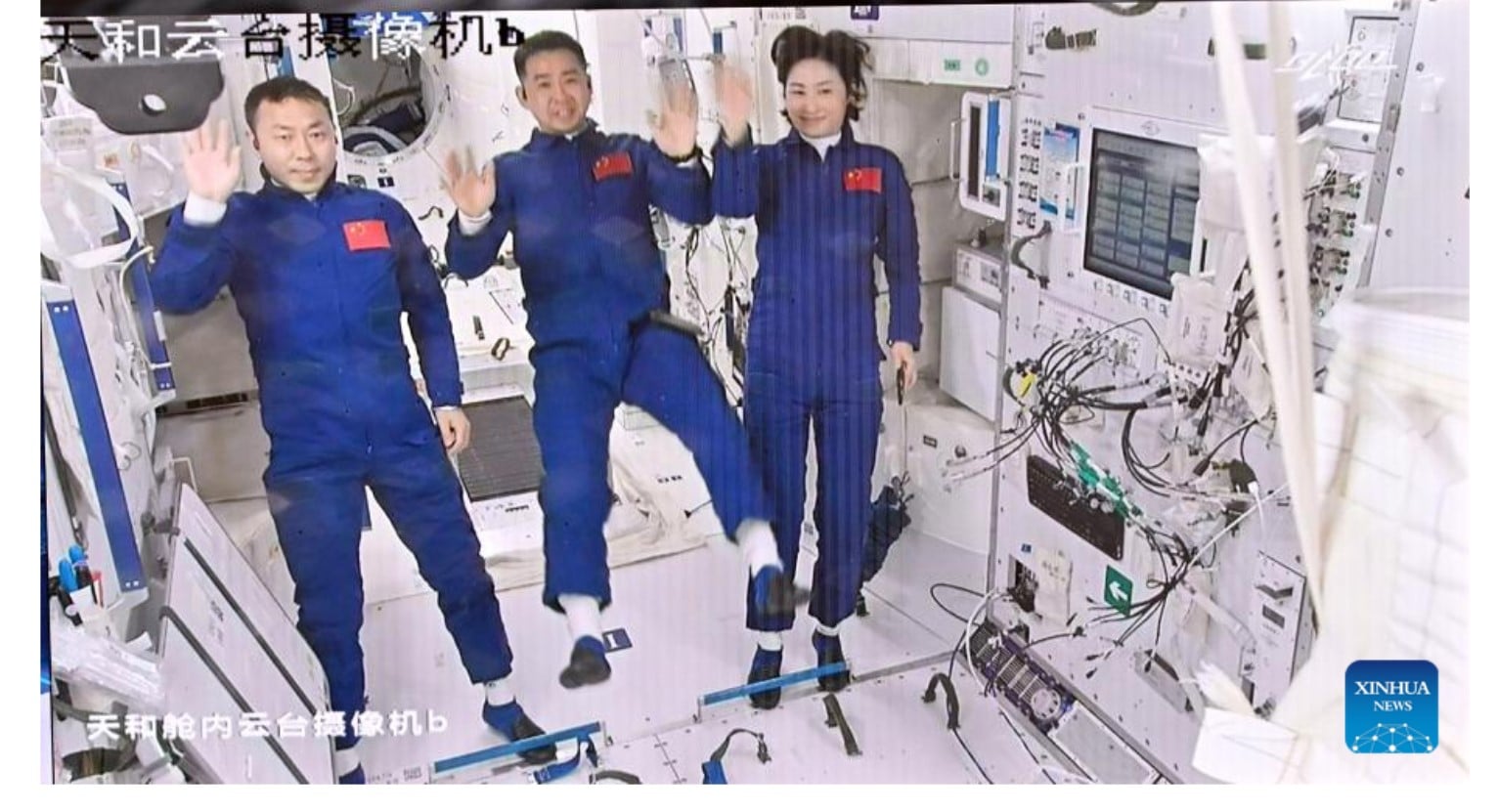 Lead image caption: Screenshot captured at Beijing Aerospace Control Center on June 5, 2022 shows three Chinese astronauts, Chen Dong (C), Liu Yang (R) and Cai Xuzhe, waving after entering the space station core module Tianhe. (Xinhua/Li Xin)