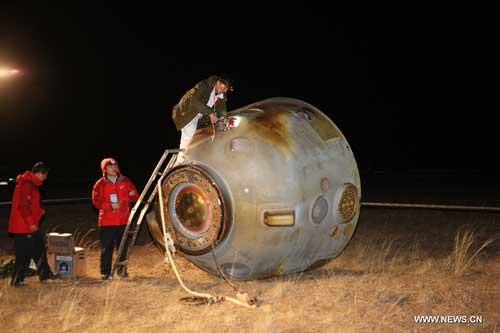 [caption id="attachment_91093" align="aligncenter" width="580" caption="The re-entry capsule of Shenzhou-8 spacecraft after landing in Inner Mongolia on Nov. 17,2011. "]
