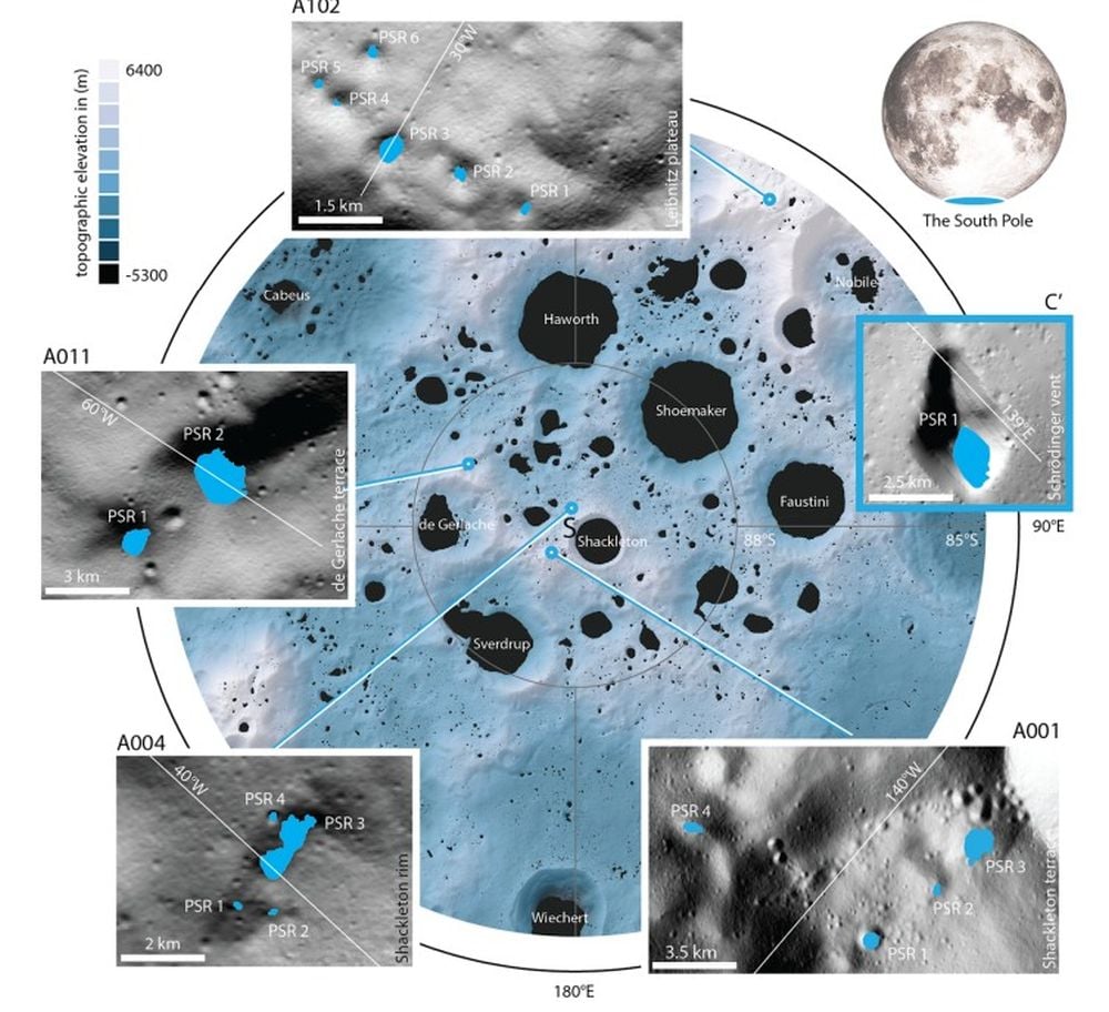 This image from the report shows permanently shadowed regions on the lunar South Pole. These regions could be desirable locations for an optical interferometer, though they present their own problems. Image Credit: W. M. KECK INSTITUTE FOR SPACE STUDIES (KISS)