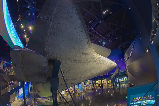 That's deliberate, though. In late June, visitors to the Orlando-area attraction got the chance to get nose-to-nose with this orbiter in a new exhibit. Atlantis, unlike similar exhibits of other shuttles so far, is perched on a precise 43.21-degree angle to give a view previously afforded only to astronauts.