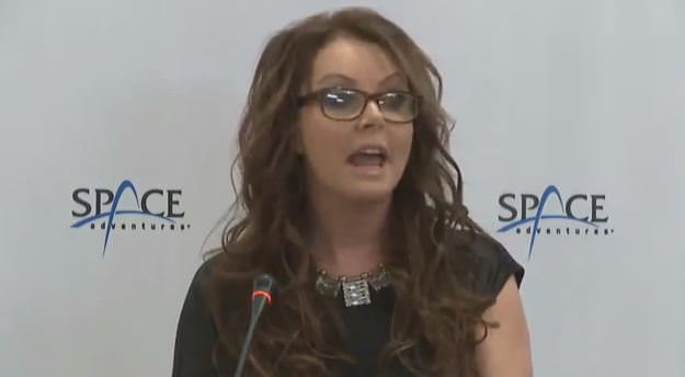 Singer Sarah Brightman at a press conference on October 10 to announce her upcoming space flight.
