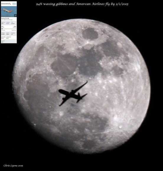 A waxing gibbous Moon with an American Airlines flyby on Feb. 2, 2015. Credit and copyright: Chris Lyons. [/caption]