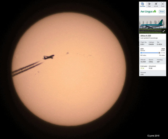 from Sebastien Lebrigand who lives about 70 km outside of Paris, France. Lebrigand is prolific: he takes almost daily images of planes passing in front of the Sun and Moon and posts them on