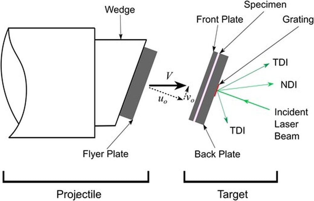 *This schematic shows how the laboratory experiment worked. It's called a pressure–shear plate impact experiment, and in it, a projectile with a wedge and a flyer plate impact two steel plates sandwiching a D. Radiodurans sample. This setup keeps the pressure and shear forces equal all across the sample. Laser interferometry and transverse displacement interferometry measure and calculated the stress to the organism as it evolves over time. Image Credit: Zhao et al. 2026. PNASNexus*