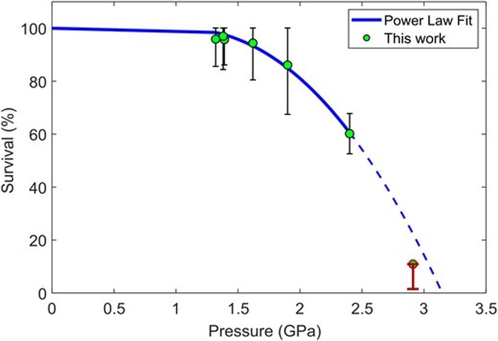 "We demonstrated that the extremophile D. radiodurans has remarkably high survivability and viability after being subjected to pressures of up to 3 GPa," the authors write. "As the pressure increases, D. radiodurans exhibited indicators of increased biological stress, as determined by the transcriptional analysis of impacted samples."