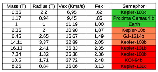 Quiroga points out that a planet with a Fex value of <0.4 would struggle to hold onto any atmosphere anyway, making life unlikely. Conversely, a Fex value of >2.2 would make space travel unlikely. "Values of Fex > 2.2 would make space travel unlikely for the exoplanet's inhabitants: they would not be able to leave the planet using any conceivable amount of fuel, nor would a viable rocket structure withstand the pressures involved in the process, at least with the materials we know (as far as we know, the same periodic table of elements and the same combinations of them govern the entire universe)."