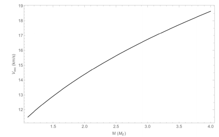 This simple graph from the research article shows the relationship between planetary mass and escape velocity. The x-axis shows Earth masses, and the y-axis shows the required escape velocity. Image Credit: Quiroga, 2024.