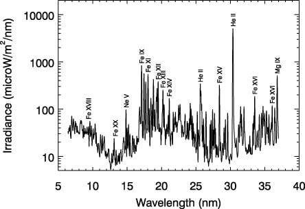 Over the course of a year, the team used the EVE (for Extreme ultraviolet Variability Experiment) instrument on SDO to record data from many more flares. EVE doesn't snap conventional images. Woods is the principal investigator for the EVE instrument and he explains that it collects all the light from the sun at once and then precisely separates each wavelength of light and measures its intensity. This doesn't produce pretty pictures the way other instruments on SDO do, but it provides graphs that map out how each wavelength of light gets stronger, peaks, and diminishes over time. EVE collects this data every 10 seconds, a rate guaranteed to provide brand new information about how the sun changes, given that previous instruments only measured such information every hour and a half or didn't look at all the wavelengths simultaneously – not nearly enough information to get a complete picture of the heating and cooling of the flare.