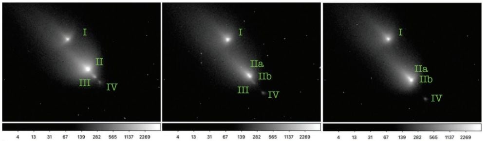 "Serendipitous HST/STIS acquisition images obtained on November 8–10 captured the comet only days after this event and resolved five fragments, providing an early high-resolution view of a nucleus in the process of disruption," the researchers explain.