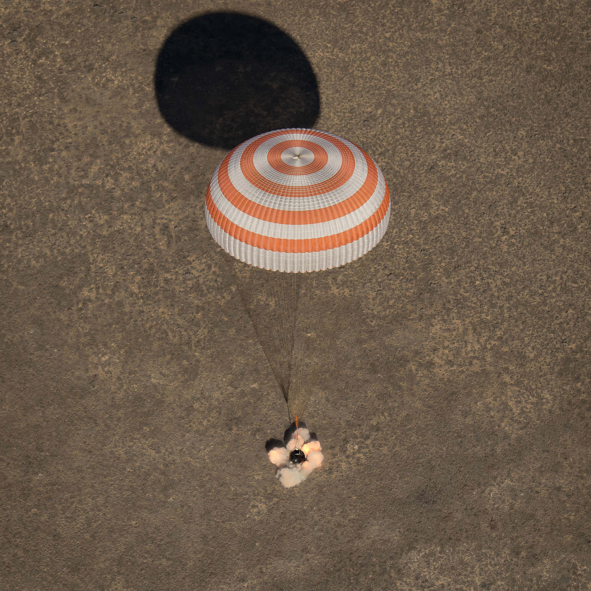 The Soyuz MS-02 spacecraft is seen as it lands with Expedition 50 Commander Shane Kimbrough of NASA and Flight Engineers Sergey Ryzhikov and Andrey Borisenko of Roscosmos near the town of Zhezkazgan, Kazakhstan on Monday, April 10, 2017 (Kazakh time). Credit: NASA/Bill Ingalls[/caption]