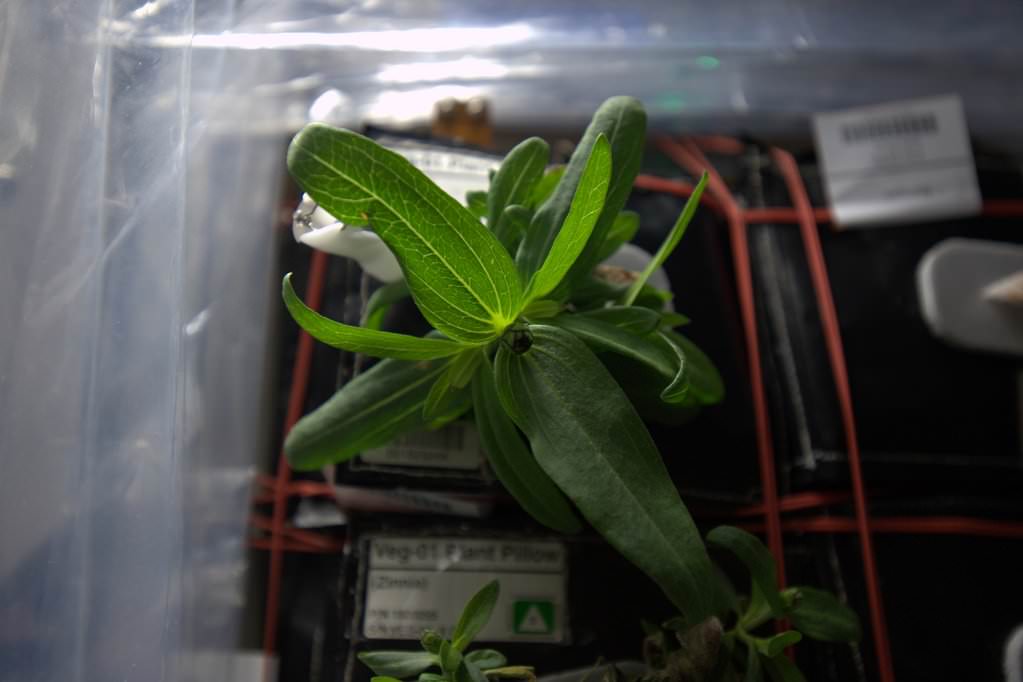 Zinnia flowers are starting to grow in the International Space Station's Veggie facility in Dec. 2015 as part of the VEG-01 investigation. Credit: NASA[/caption]