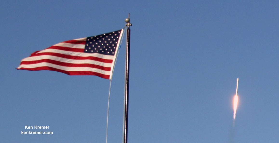 The 'used' SpaceX Falcon 9 launches the SES-10 telecomsat to orbit from historic Launch Complex 39A as it zooms past US Flag by the countdown clock at NASA's Kennedy Space Center in Florida at 6:27 p.m. EDT on March 30, 2017. Credit: Ken Kremer/Kenkremer.com[/caption]