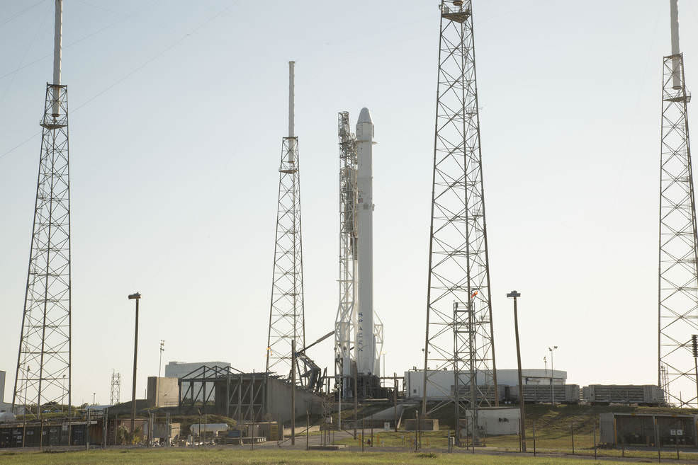 A Falcon 9 rocket with a Dragon spacecraft stand at Space Launch Complex 40 at Cape Canaveral Air Force Station before the CRS-8 mission to deliver experiments and supplies to the International Space Station. Credits: SpaceX[/caption]