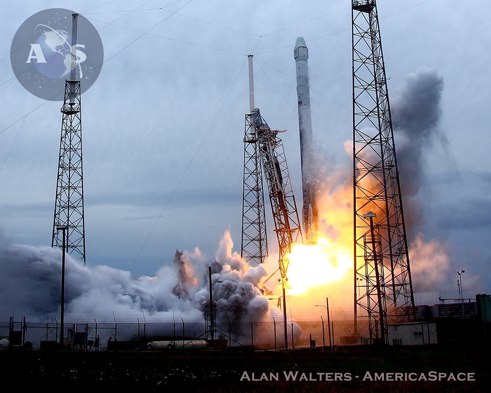 Rising slowly from Pad 40, the fully loaded Dragon and Falcon 9 v1.1 vehicle begin the mission to ISS. Credit: nasatech.net[/caption]