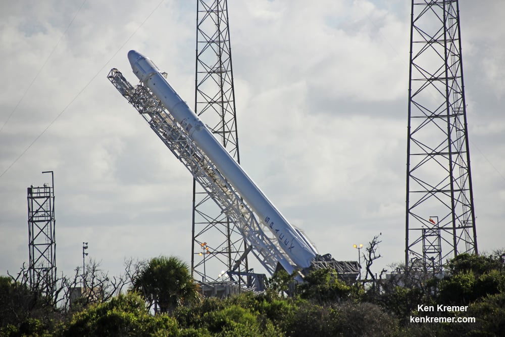 SpaceX Falcon 9 rocket goes erect to launch position atop Launch Complex 39A at the Kennedy Space Center on 1 Jun 2017 as seen the morning before later afternoon launch from inside from the pad perimeter. Liftoff of the CRS-11 resupply mission to the International Space Station (ISS) slated for 1 June 2017. Credit: Ken Kremer/Kenkremer.com[/caption]
