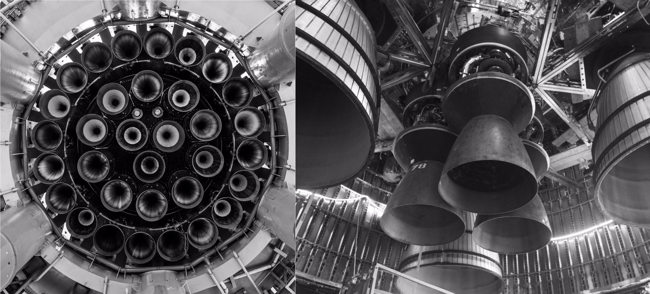 The photos of the BN7s engines (left) show its 33 Raptor 2 engines - optimized for sea level - arranged in two concentric circles with three clustered in the center. On the other hand, the Starship 's complement of engines includes three Raptor 2s arranged around an outer ring and three Raptor Vacuum engines (optimized for space) arranged in a cluster in the center. This represents the most recent configuration for the entirely reusable, super-heavy launch system, which will be fully stacked for the orbital flight test.