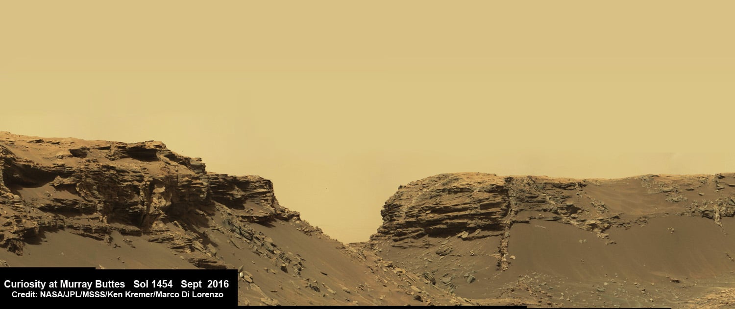 Wide angle mosaic view shows spectacular buttes and layered sandstone in the Murray Buttes region on lower Mount Sharp from the Mastcam cameras on NASA's Curiosity Mars rover. This photo mosaic was assembled from Mastcam color camera raw images taken on Sol 1455, Sept. 9, 2016 and stitched by Marco Di Lorenzo and Ken Kremer, with added artificial sky. Credit: NASA/JPL/MSSS/Ken Kremer/kenkremer.com/Marco Di Lorenzo[/caption]