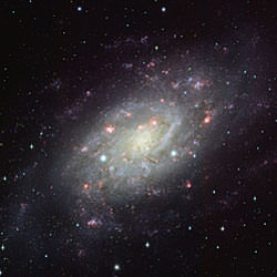 . Subaru Telescope, using Suprime-Cam, took the clearest most complete image to date of the spiral galaxy NGC 2403. At a distance of 10 million light years, NGC 2403 is an Sc type galaxy, which has open spiral arms and a small nucleus. It is approximately half the mass of our own galaxy, the Milky Way, and has an abundance of neutral hydrogen gas. In the spiral arms we see active star formation regions in red, clusters of young blue stars called OB associations, and darker regions called dust lanes where light is blocked by gas and dust within the galaxy.