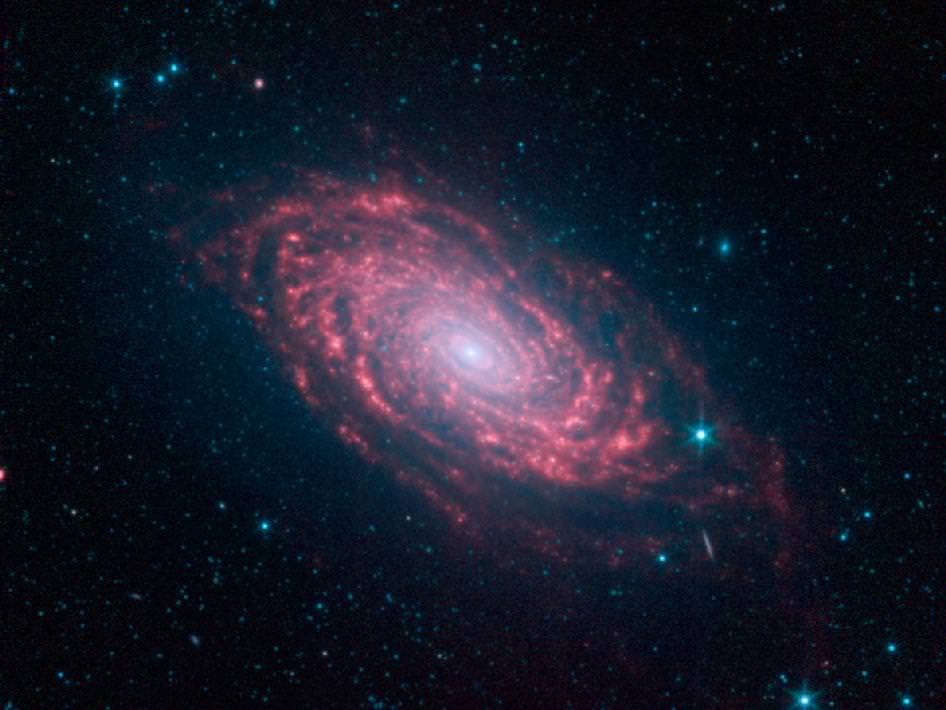 Looking out my own window this morning provides a gloomy overcast view, so this new image from the Spitzer Space Telescope provides a day-brightener: a pink sunflower! This is the Sunflower galaxy, also known as Messier 63, and with Spitzers' infrared eyes, the arms of the galaxy show up vividly. Infrared light is sensitive to the dust lanes in spiral galaxies, which appear dark in visible-light images. Spitzer's view reveals complex structures that trace the galaxy's spiral arm pattern.