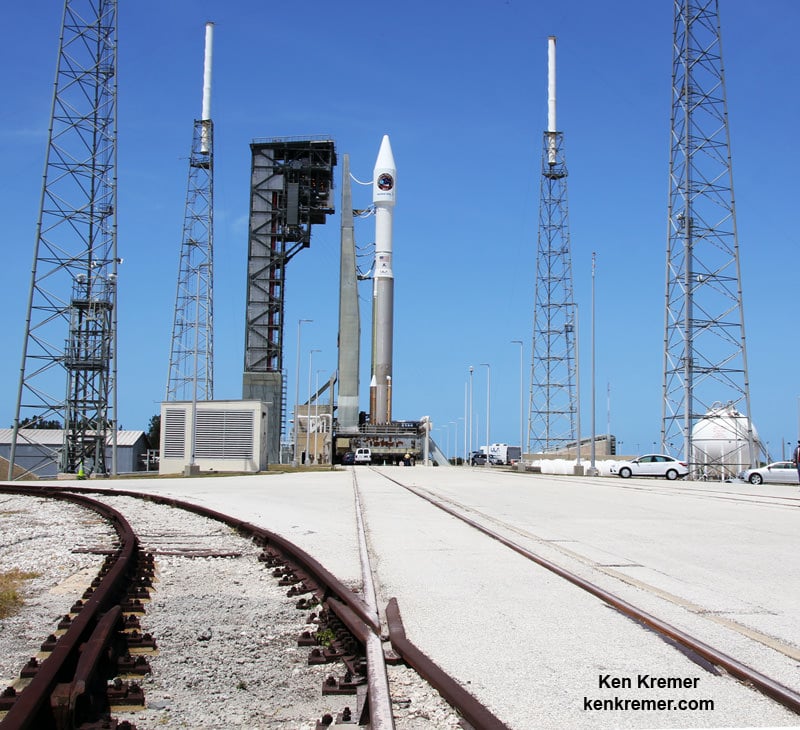 stands proudly poised for launch at pad 41 from the Florida Space Coast on Tuesday April 18, loaded with a stash of nearly 4 tons of science investigations and essential supplies atop a United Launch Alliance Atlas V rocket destined for the multinational crew aboard the International Space Station (ISS).