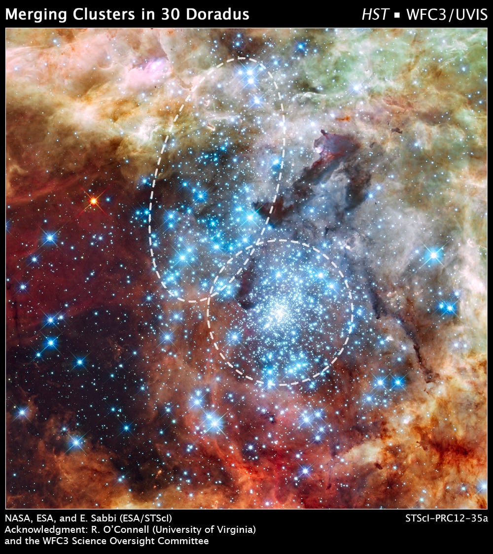 Astronomers originally thought that just one massive star cluster shone brightly in a huge star forming region of the Tarantula Nebula, also known as 30 Doradus. But closer analysis using data from the Hubble Space Telescope shows that it is actually two different clusters that are just starting to collide and merge. A team of astronomers led by Elena Sabbi of the Space Telescope Science Institute noticed that different stars in the same region were of different ages, by at least one million years. Besides the age differences, the scientists also noticed two distinct regions, with one having the elongated "look" of a merging cluster.