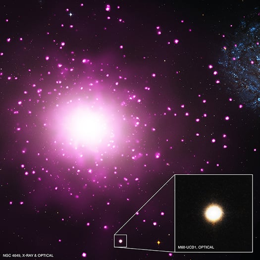 M60-UCD1 is located near a massive elliptical galaxy NGC 4649, also called M60, about 60 million light years from Earth. The galaxy was discovered with NASA's Hubble Space Telescope and follow-up observations were done with NASA's Chandra X-ray Observatory, the Keck Observatory in Hawaii, and the Multiple Mirror Telescope in Arizona.
