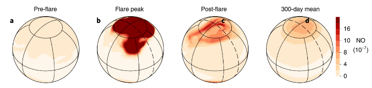 Another interesting result of this study concerns exoplanet magnetospheres. They find that hyperflares may help reveal the nature and extent of magnetospheres. "More speculatively, proton events during hyperflares may reveal the existence of planetary-scale magnetic fields by highlighting particular regions of the planet. By identifying nitrogen- or hydrogen oxide-emitting flux fingerprints during magnetic storms and/or auroral precipitation events, one may be able to determine the geometric extent of exoplanetary magnetospheres."